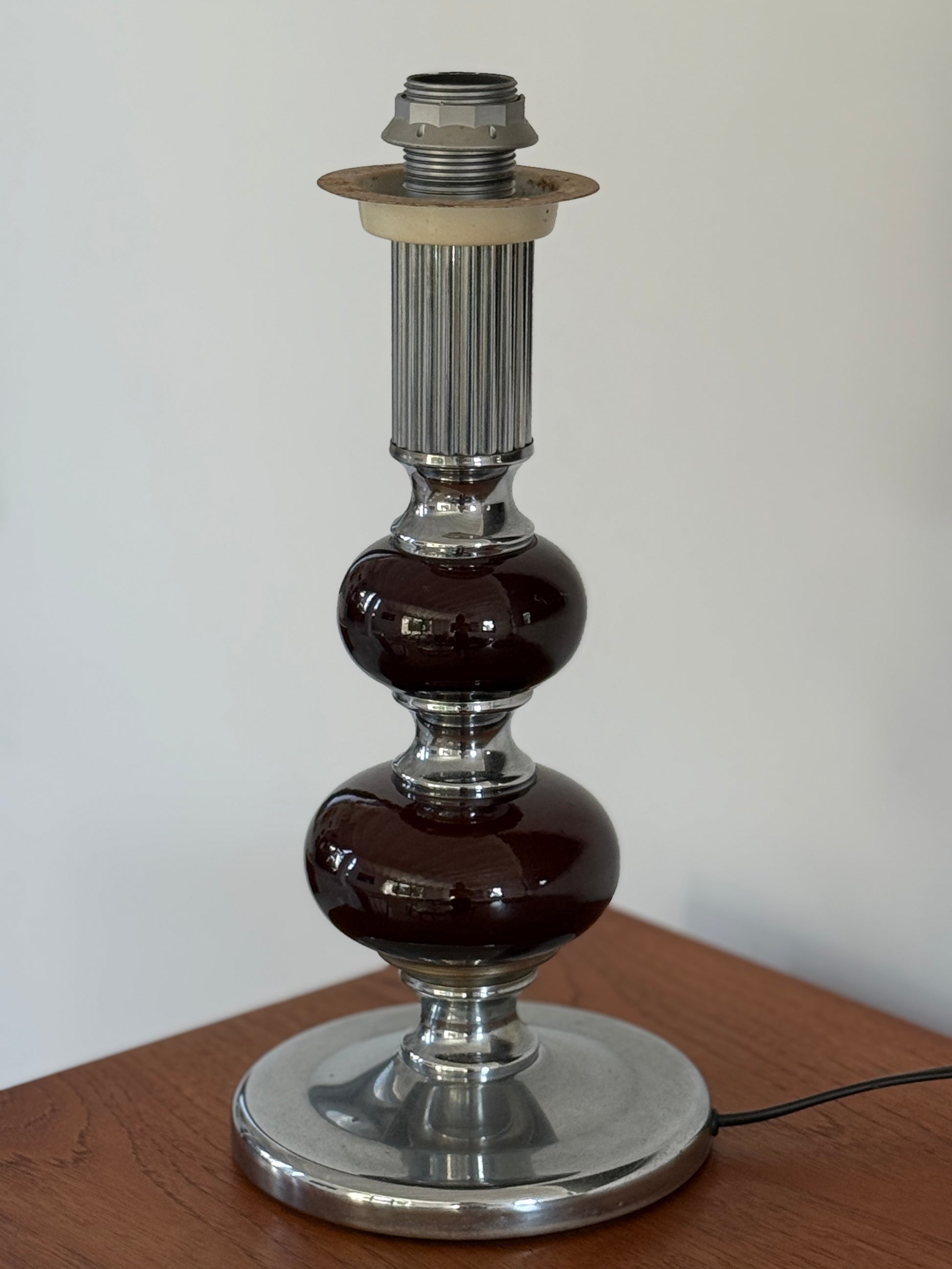 1980s table lamp with chrome detailing and a glass base. Sold without a shade, so you can style it your way.
